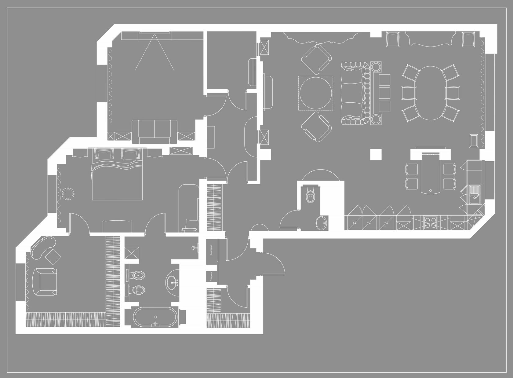 Прежде всего мы отталкивались от образа жизни, предпочтений и вкусов заказчиков. Предполагалось, что к ним будут часто приходить гости, это делало естественным организацию схемы Гостиная + Столовая + Кухня, как единое помещение, причём кухня, как и другие помещения должна иметь парадный вид.