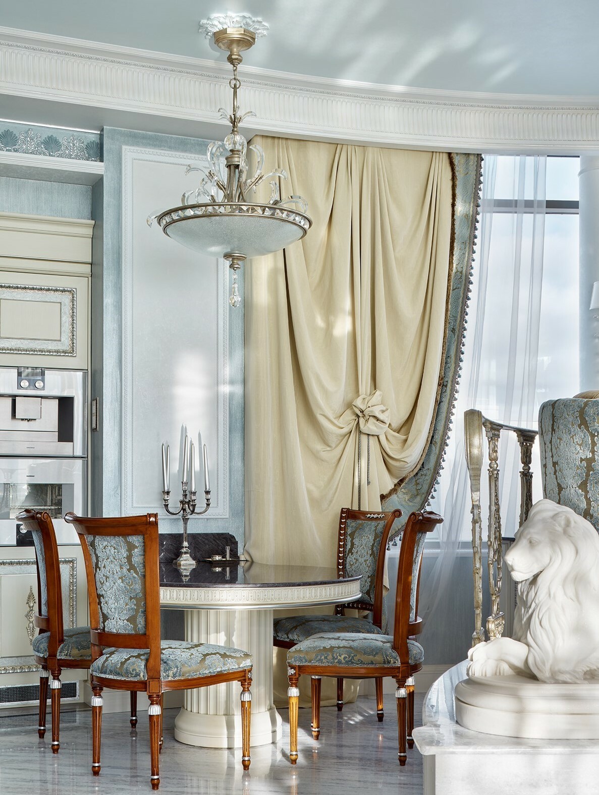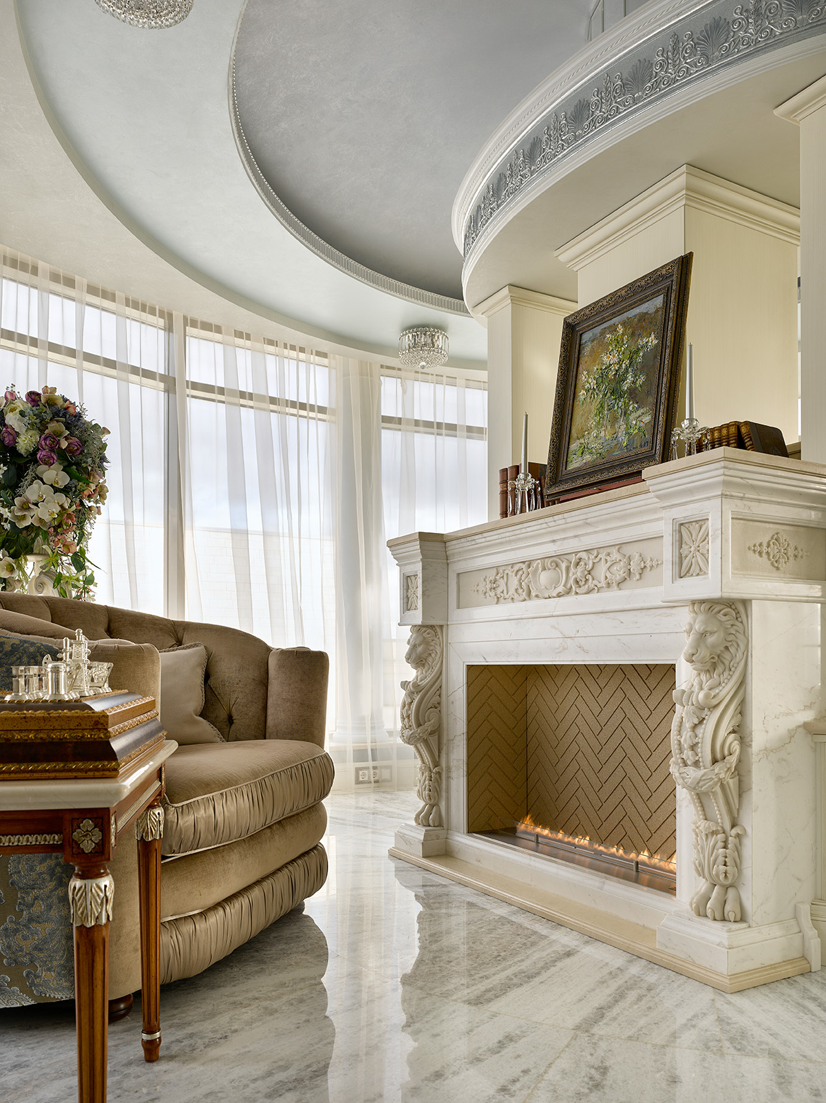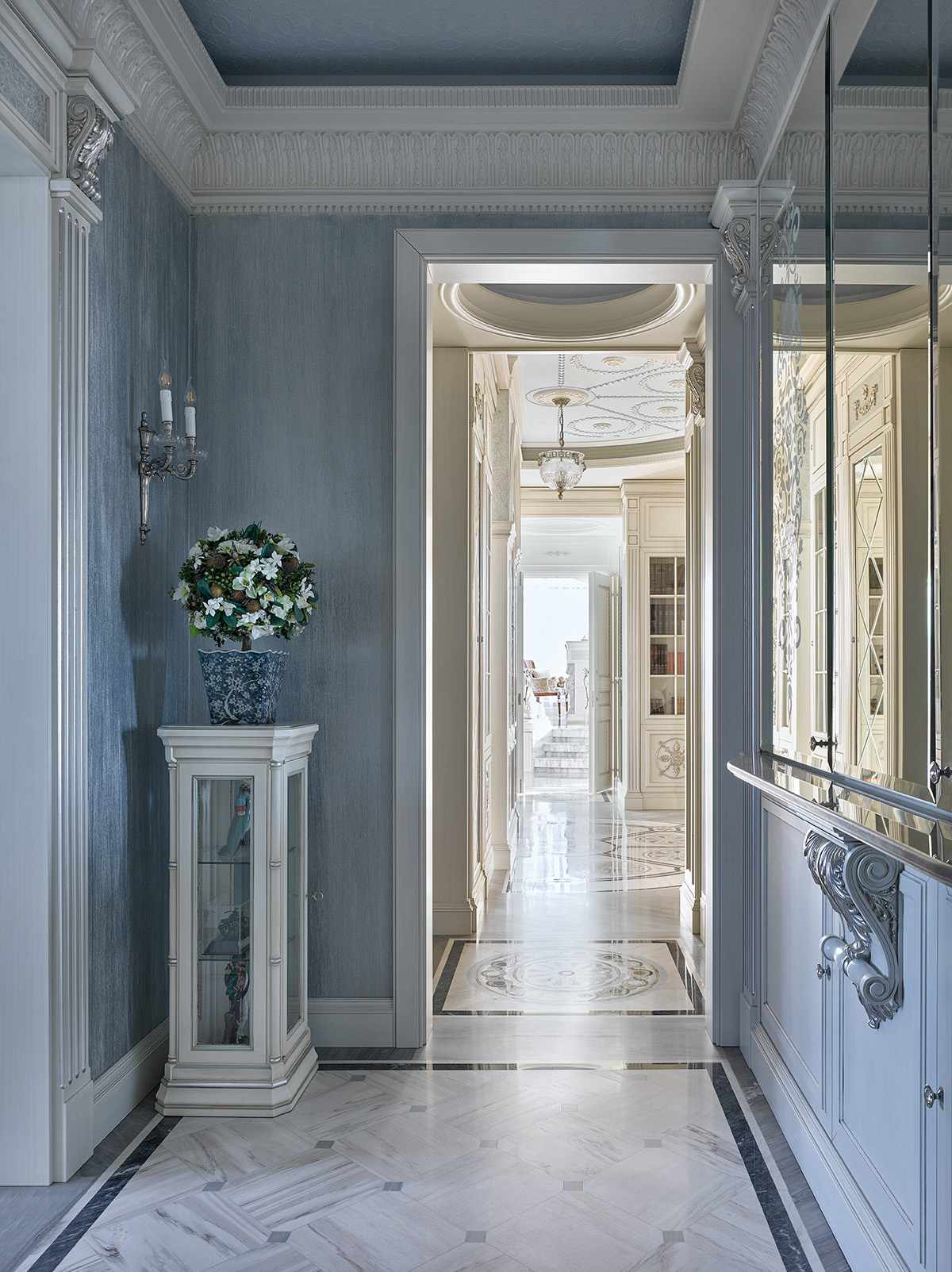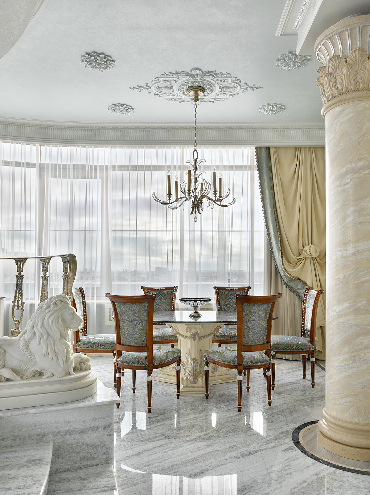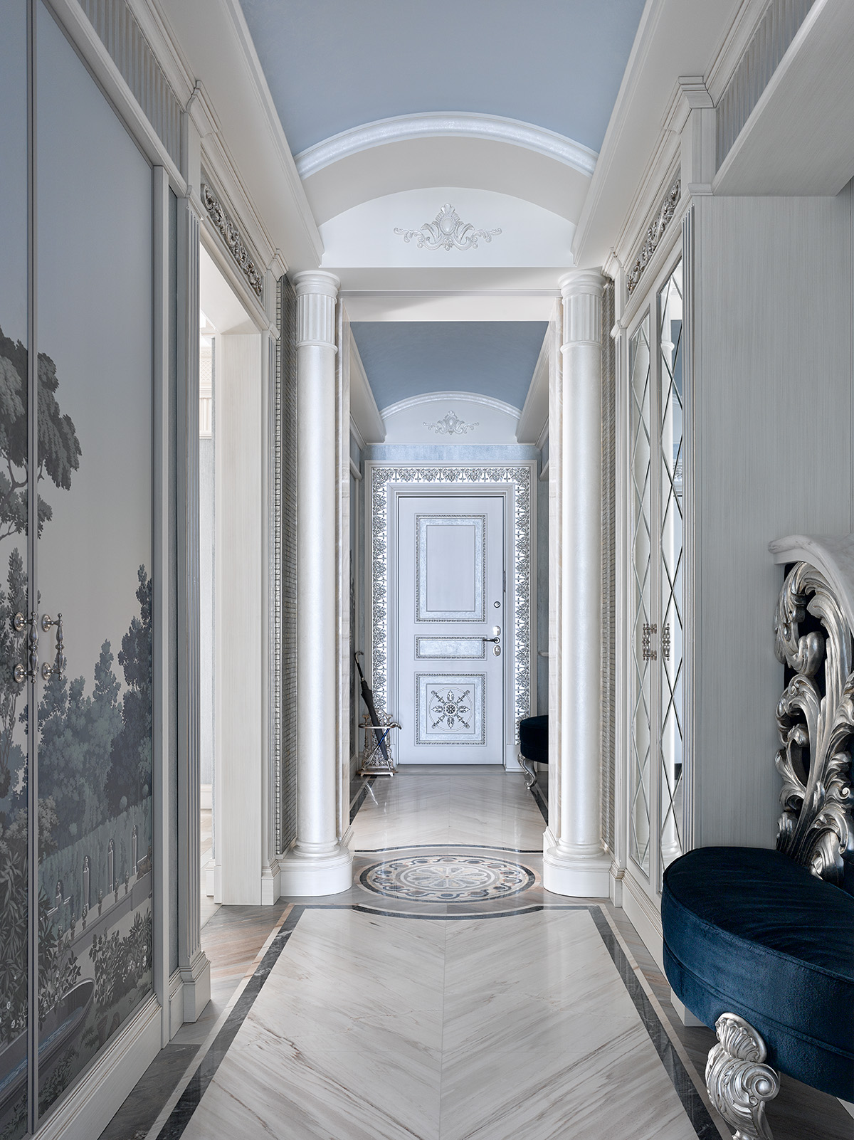 Классический стиль квартиры был выбран по двум причинам: это и имперское влияние города, и готовность заказчиков к такому интерьеру. Расположение квартиры и наличие панорамных окон дало возможность использовать в интерьерах виды города и большого открытого неба, как дополнительную декорацию. Отсюда и родилась цветовая гамма объекта - много чистых голубых тонов, нежное серебро и растворяющий границы перламутр. Также стояла задача сделать доступными все качества современного дома – он должен быть комфортным и удобным для проживания, обладать самым современным техническим наполнением.