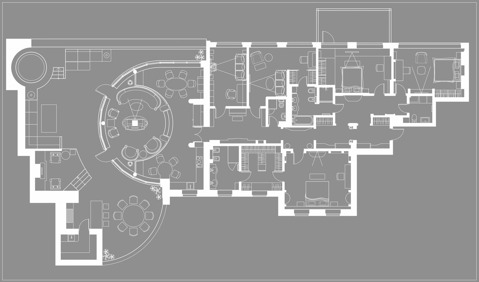 Квартира находилась на последнем этаже жилого дома и имела свою террасу на крыше более низкой части здания. Гостиную заказчики попросили расположить рядом с ней. Вход в квартиру был на ее противоположной от террасы стороне, и эту задачу можно было решить только «прорубанием» длинного коридора через всю квартиру. Ужасный приём! Мы давно ушли от использования коридорной системы в наших проектах.